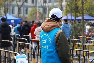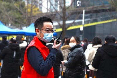 此时,另一家园区企业中科大旗的志愿者郑元平正在检测队伍外侧进行排队秩序维护。“我是一名有12年党龄的老党员,哪里有需要,我就应该往哪里冲。”据郑元平介绍,在新冠疫情发生以来,中科大旗党支部曾主动参与过多次防疫志愿活动,在2021年,中科大旗党支部还获得了“成都市先进基层党组织”称号。
